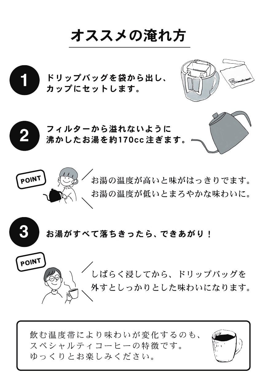封を切ったドリップバッグをお気に入りのカップにセットし、沸騰したお湯、約170ccを注ぐだけ!温度帯により味わいが変化するのも、スペシャルティコーヒーの特徴です。ゆっくりとお楽しみください♪